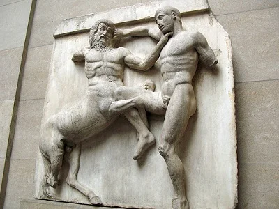 The metopes of the southern wall (Plaques No. 1–12 and 21–32) present the Battle of the Lapiths and Centaurs, also known as the Centauromachy, in which the mythological Athenian king Theseus took part. The battle between the Centaurs and the Lapiths broke out during the wedding feast of the king of the Lapiths and personal friend of Theseus, Pirithous. According to one version of the myth, the Centaurs, insulted from being excluded from the celebrations, attacked the Lapiths while according to another, during the feast drunken Centaurs reacted violently under the influence of wine. The result was a fight between the Centaurs and the Lapiths and an attempt of the former to abduct the Lapith women.