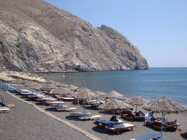On the east side of Santorini and north of Kamari the first beach you find is called Monolithos it’s behind the airport but to reach it you must take another road because the one from Kamari doesn’t lead there, there are sun loungers and umbrelas the sand is a rich black and there are a few tavernsand cafes.