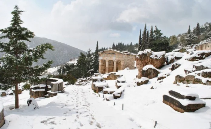 The ruin of the temple of Apollo at Delphi in winter