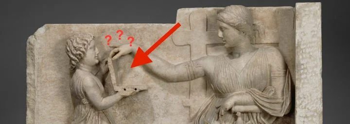 A photo being widely shared on social media shows what some claim is a laptop computer in a funerary relief from ancient Greece.