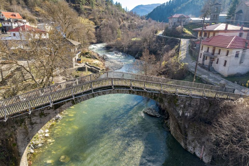 Vovousa’s defining landmark is its magnificent stone arched bridge, which has stood proudly over the rushing Aoos since 1748. This bridge permanently connects the two neighborhoods on either side of the river and once served as a vital passage between Epirus and Macedonia. Built by Alexis Misios from Monodendri, it is the oldest bridge in Zagori still in use and is now protected as a modern historical monument.