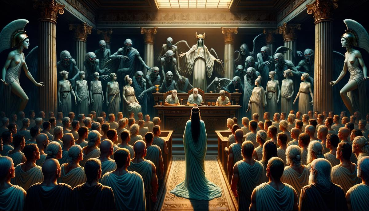 Eventually, Orestes was brought to trial in Athens, where the goddess Athena intervened. In a landmark judgment, she acquitted Orestes, ending the cycle of vengeance and establishing a new system of justice based on law rather than revenge.