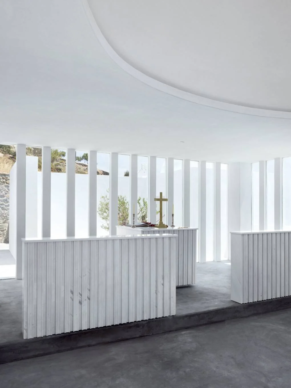 The sheltered courtyard garden, planted with a single olive tree, leads to a separate baptismal chapel that forms a smaller echo of the domed nave. There is also what is known as the meltemi chapel, named after the local meltemi winds. This is a quiet, contemplative hybrid space positioned towards the edge of the hillside, open to the blue sky but partly protected from the winds by its high rounded walls, which also feature integrated seating. All these elements are distinct, yet they share a common language and each contributes an important element to the chapel as a whole.